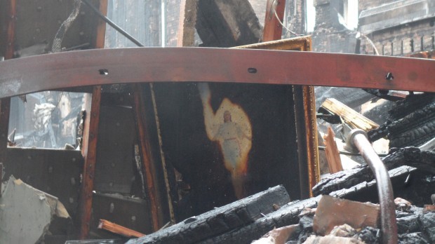 I was reading about the tabernacle when someone sent me a picture—one of the firefighters had found a charred picture of Christ in the ruins—the flames had burnt the entire picture up to his outline, then stopped.