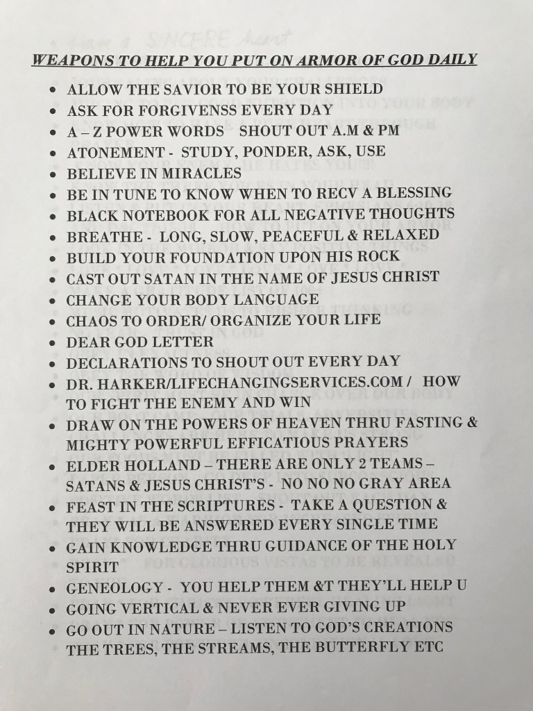 And here’s a list from I forget who, and the list is obviously incomplete, of things you can do everyday to help you acquire your spiritual armor.